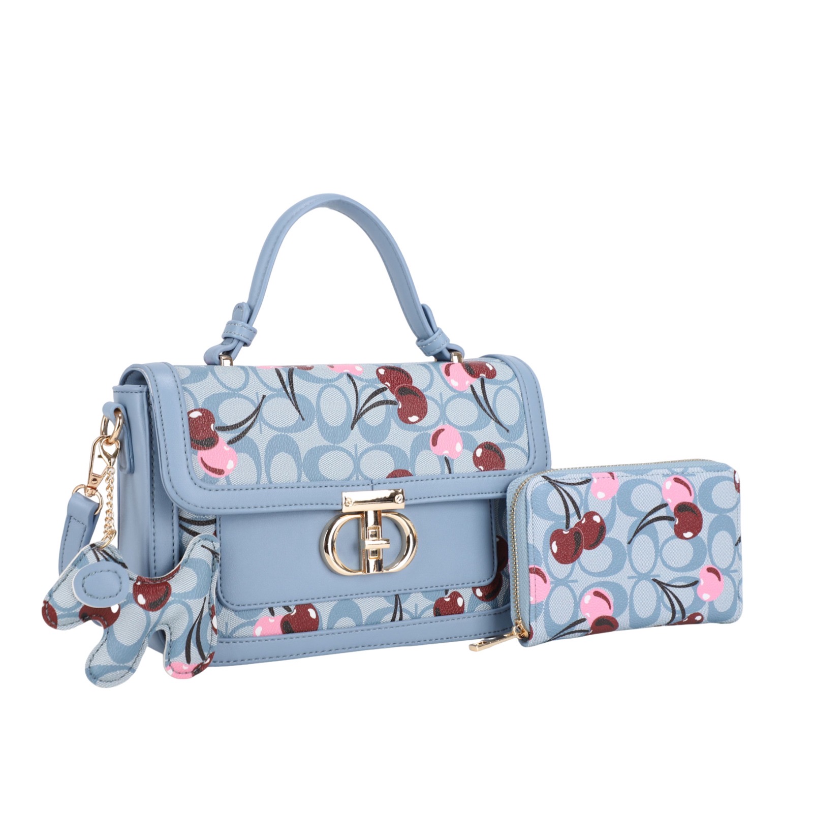 - 2- in-1 Oval Chery Print Monogram Satchel Set + KeyChain Charming & Wallet