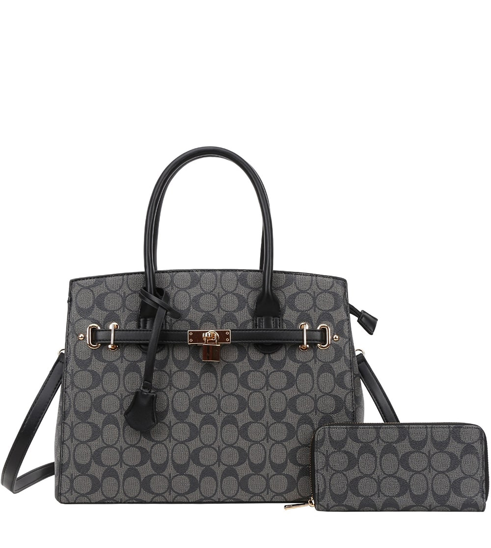 - 2-in-1 Oval Print Monogram Padlock Satchel Set + Wallet