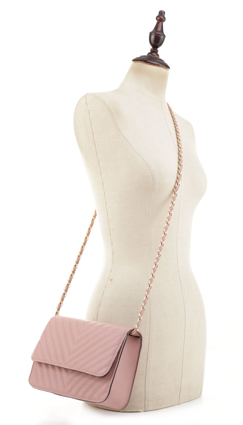 - Chevron quilted crossbody with magnetic snap closure.