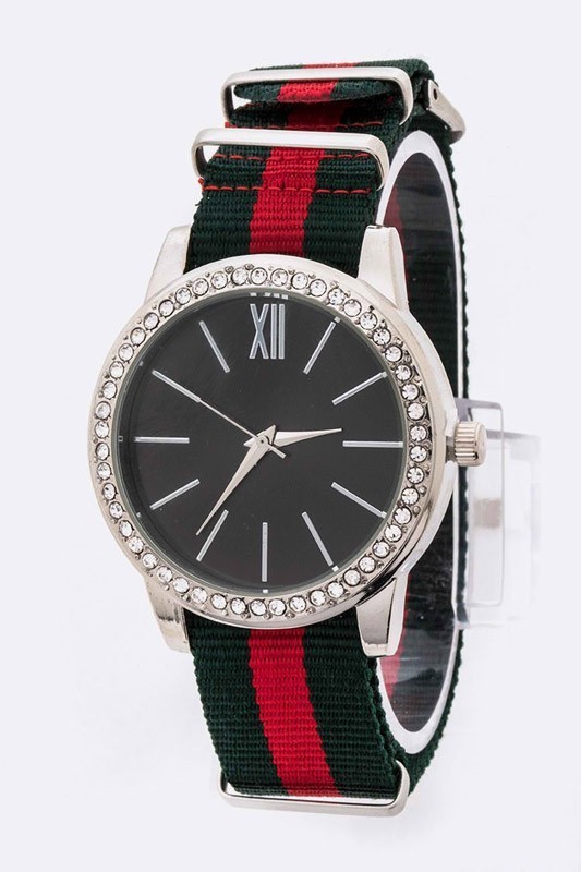 Chic Crystal Bezel Iconic Stripe Strap Watch