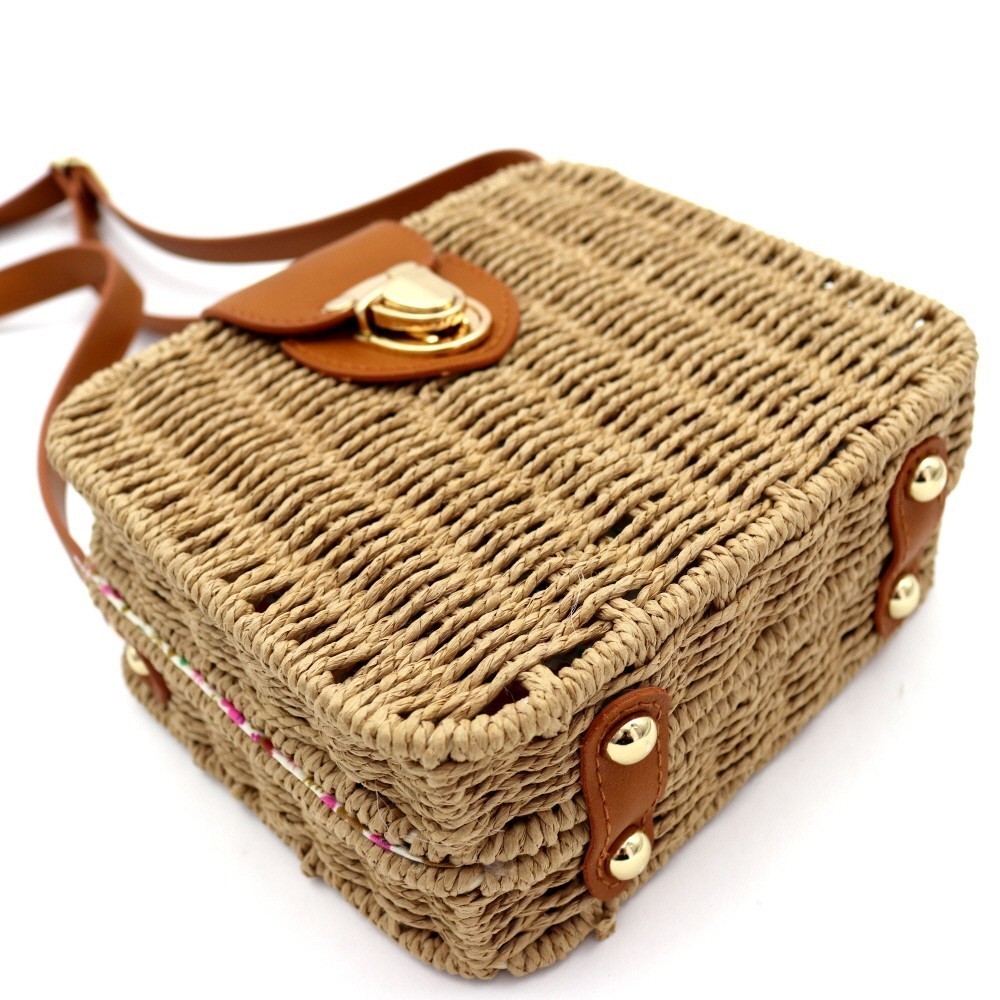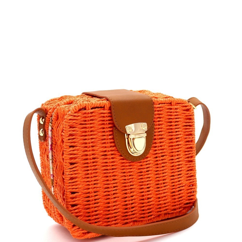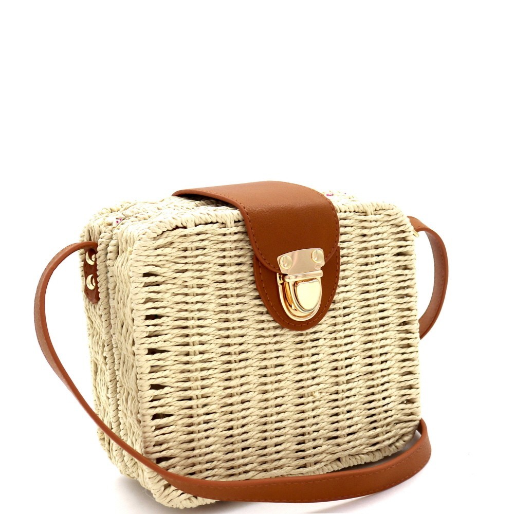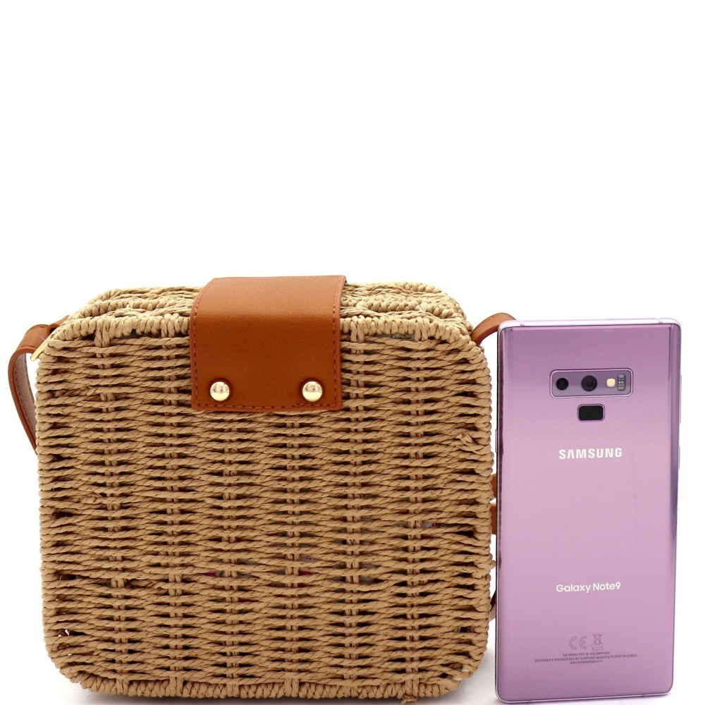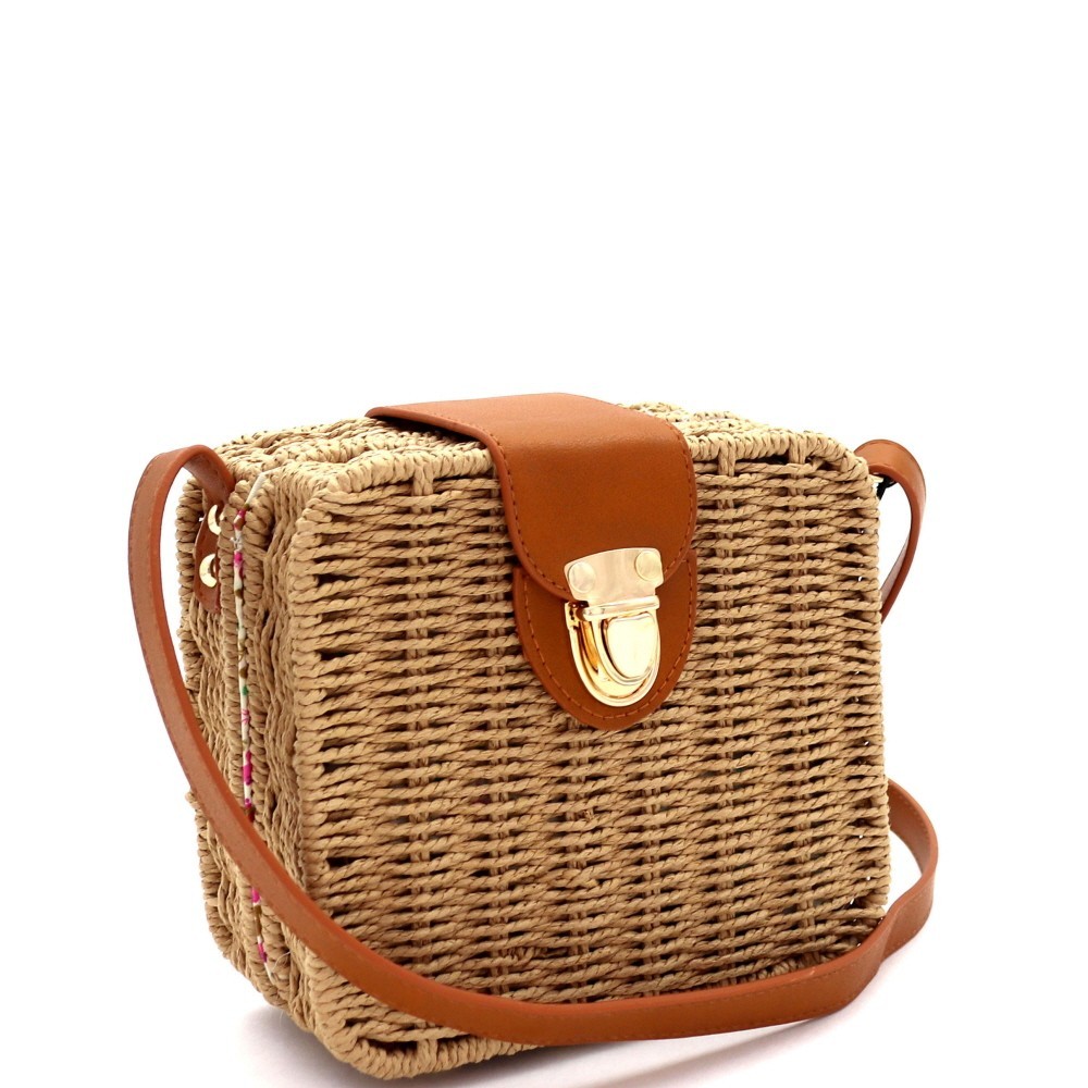 Push-Lock Woven Bamboo Rattan Boxy Crossbody Shoulder Bag