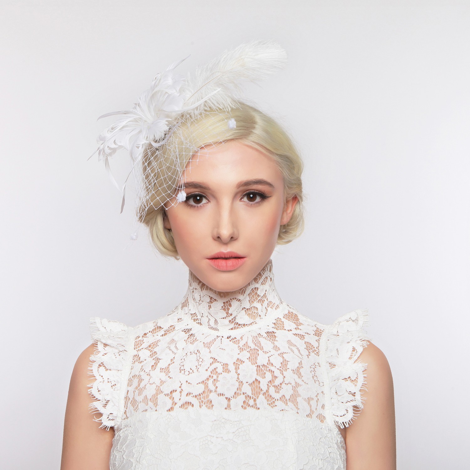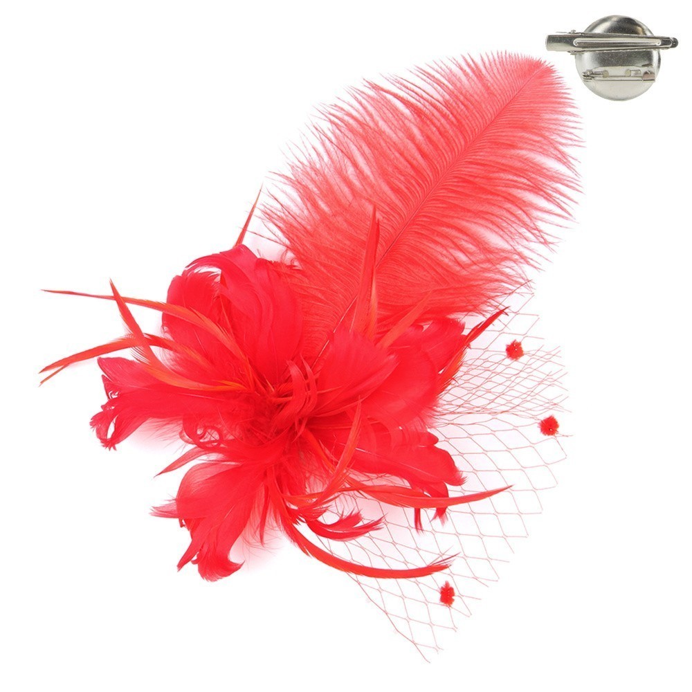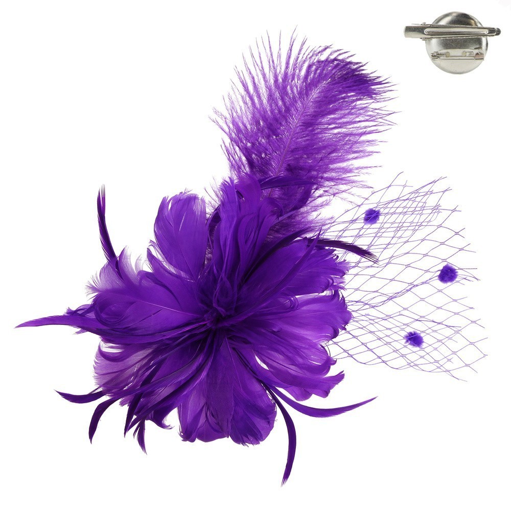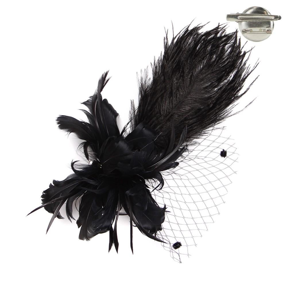 - Feather Flower with Dotted Netting and Large Feather Plume Hair Clip Fascinator.