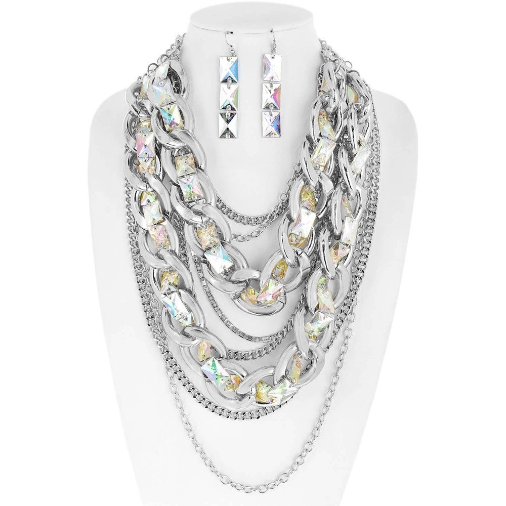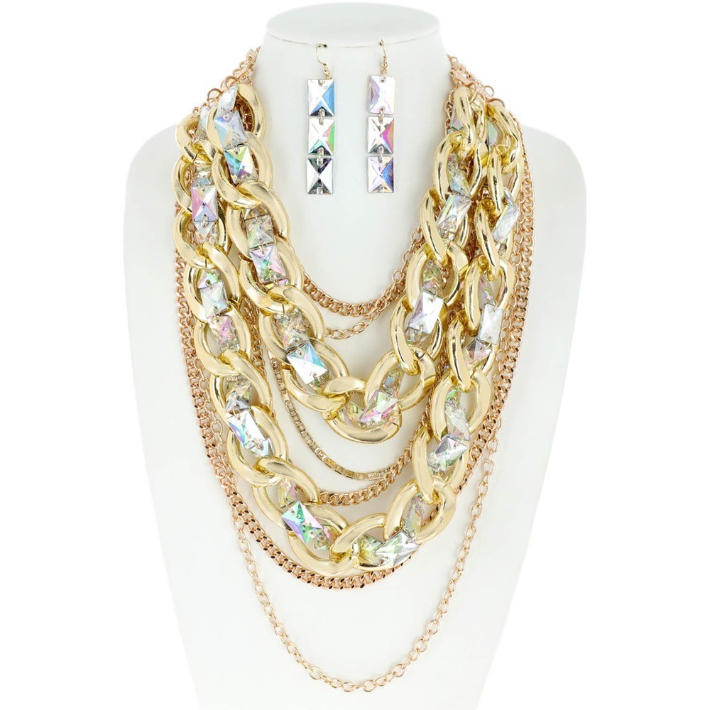 - MULTI LAYERED CHAIN AND GEM STONE CHUNKY NECKLACE AND EARRINGS SET