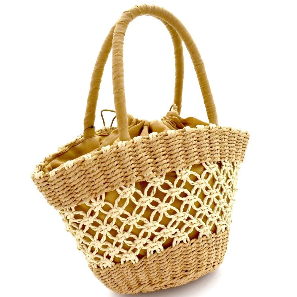 • Two-Tone Drawstring Finish Straw Basket Satchel MH-PPC6092