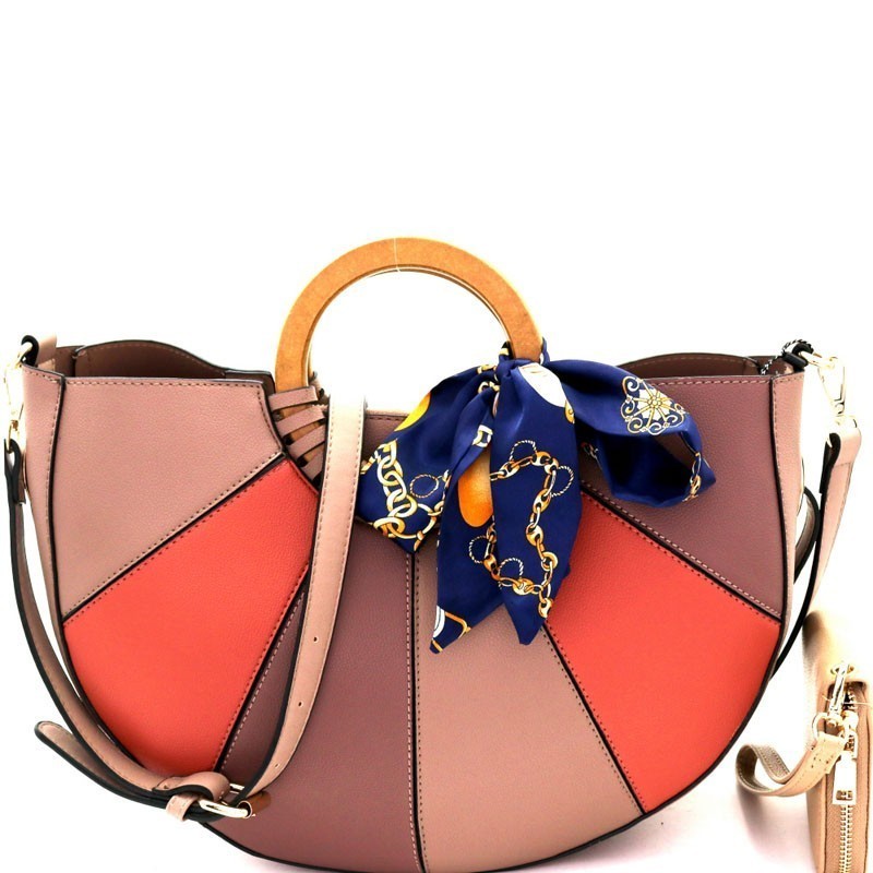 Wooden Handle Color Block Satchel Wallet SET MH-DB7143W
