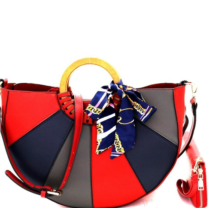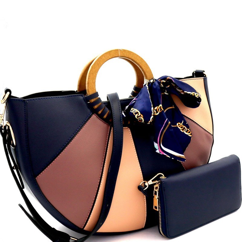 - Wooden Handle Color Block Satchel Wallet SET MH-DB7143W